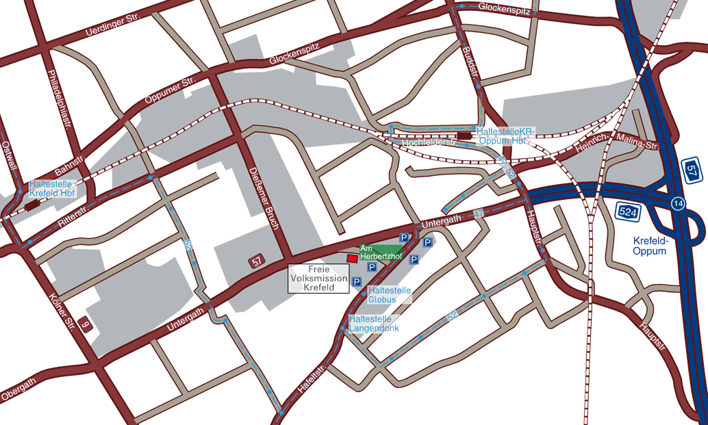 bis zur Abfahrt Krefeld-Oppum (14), weiter auf dem Untergath, dann 3. Ampel links in die Hafelstraße und kurz darauf rechts in Am Herbertzhof abbiegen